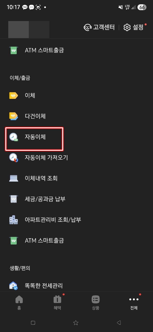 - 앱 실행 후 [전체 메뉴] → [자동이체]