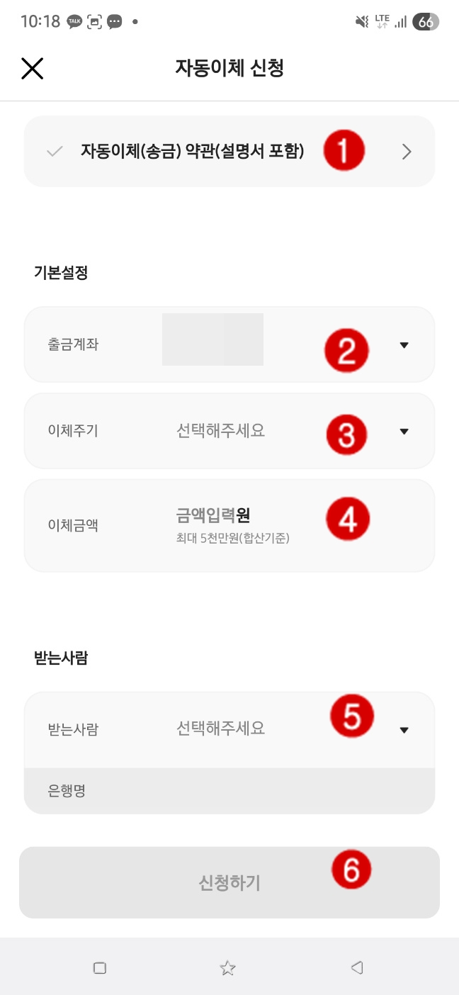 - 출금 계좌,이체 주기, 이체금액, 받는사람계좌 등록 신청 (매주 / 매월 / 특정일 등)