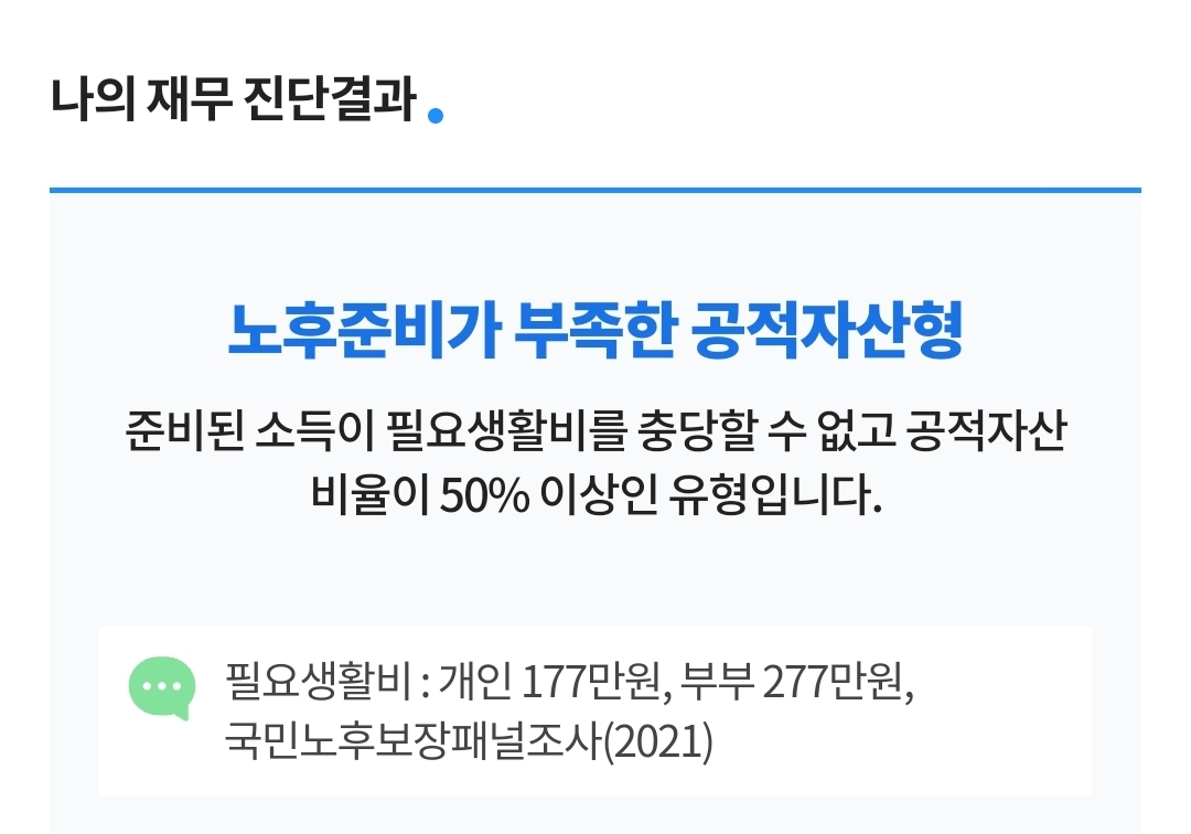 진단 결과, 저의 노후 준비는 노후준비가 부족한 공적자산형으로 나타났습니다. 필요 생활비 부분에서는 추가적인 준비가 필요하다는 평가를 받았습니다.